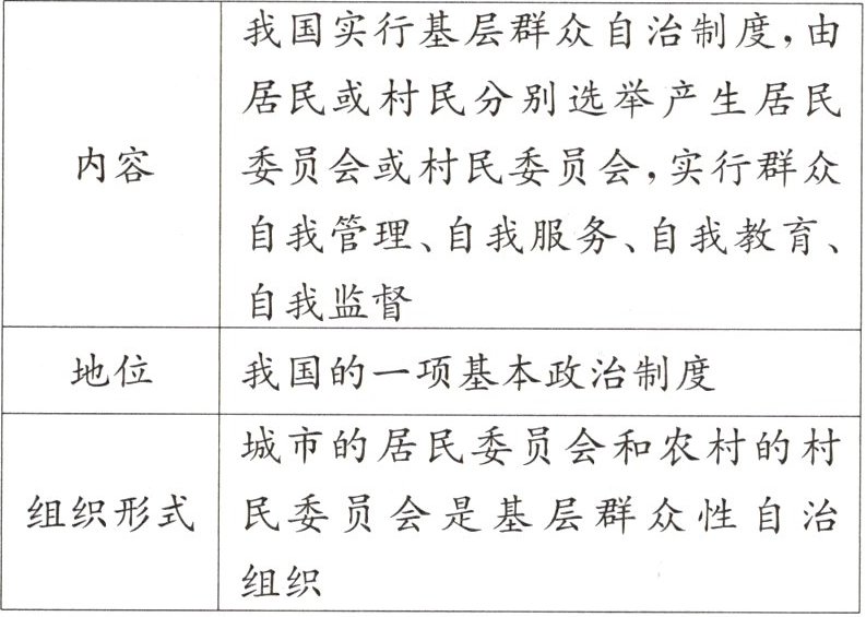 内容:我国实行基层群众自治制度,由居民或村民分别选举产生居民委员会或村民委员会,实行群众自我管理、自我服务、自我教育、自我监督