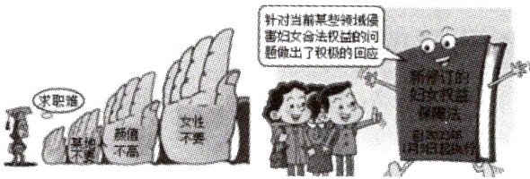 【解析】 本题考查维护社会公平正义。漫画中“求职难”违背了同等情况同等对待,面对就业歧视等不平等现象,求职者应采用合理合法的方式谋求最大限度的公平,B说法正确但不符合题意;新修订的妇女权益保障法维护了妇女的合法权益,为维护社会的公平正义提供了法律保障,A说法正确但不符合题意;两幅漫画内容告诉我们实现公平正义是国家、社会、全体公民的共同责任,C说法正确但不符合题意;D说法错误,没有绝对的平等,符合题意。