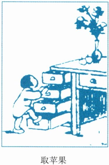 小明灵机一动,看到旁边的抽屉,他开始拉抽屉,把抽屉一个一个拉出来,然后踩着抽屉往上爬,嘴里还念叨着:“我一定要拿到苹果。”