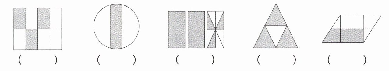 1. 下面各图中的阴影部分,能用分数表示的就在括号里写出这个分数,不能用分数表示的画“×”。