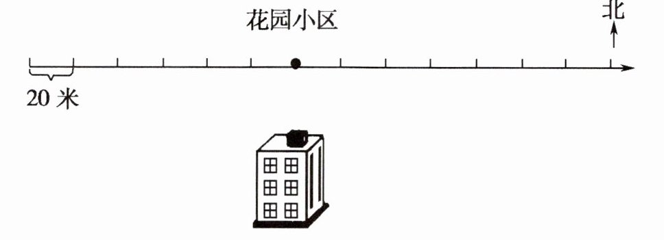 - 购物广场在花园小区东$100$米处,$100\div20 = 5$(段),所以从花园小区向东数$5$段的位置就是购物广场的位置。