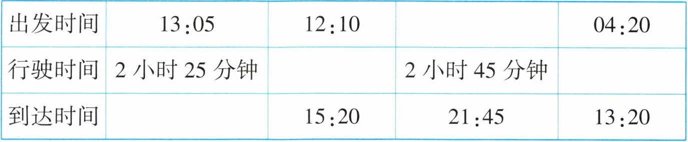 - 第一个空:已知出发时间$13:05$,行驶时间$2$小时$25$分钟,$13$时$05$分$ + 2$小时$25$分钟$ = 15$时$30$分,即$15:30$。