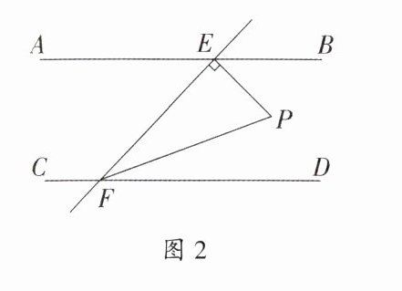2. 如图 2,$AB// CD$,$EF与AB$、$CD分别相交于点E$、$F$,$EP⊥EF$,与$∠EFD的平分线FP相交于点P$,且$∠BEP = 50^{\circ}$,则$∠EPF = ()$度.