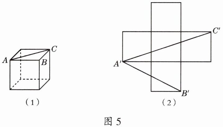3. 如图5(1)所示为一上面无盖的正方体纸盒,现将其剪开展成平面图;如图5(2)所示,已知展开图中每个正方形的边长为1,求在该展开图中可画出最长线段的长度.这样的线段可画几条?