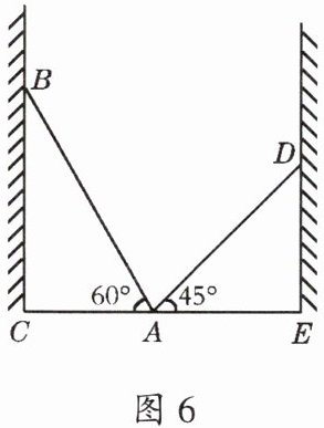 3. 如图6,两面墙之间有一底端在A点的梯子,它靠在一侧墙上,顶部(梯子)在B点,它靠在另一侧墙时,顶部在D点.已知$\angle BAC= 60^{\circ}$,$\angle DAE= 45^{\circ}$,D到地面垂直距离$DE= 3\sqrt{2}$米.求点B到地面的垂直距离BC的长.