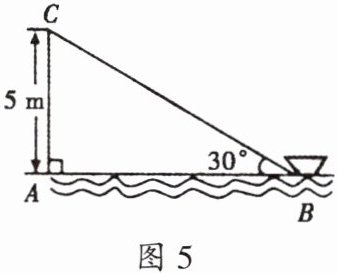 2. 如图 5,在离水面高度为 5m 的岸上有人用绳子拉船靠岸,开始时绳子与水面的夹角为$30^{\circ}$,此人以每秒 0.5m 的速度收绳。