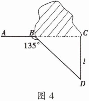 1. 如图 4,修公路遇到一座山,于是要修一条隧道。为了加快施工进度,想在小山的另一侧同时施工。为了使山的另一侧的开挖点$C在AB$的延长线上,设想过$C点作直线AB的垂线l$,过点$B$作一直线(在山的旁边经过),与$l相交于D$点,经测量$\angle ABD = 135^{\circ}$,$BD = 800$米,求在直线$l上距离D点多远的C$处开挖?($\sqrt{2} \approx 1.414$,精确到 1 米)