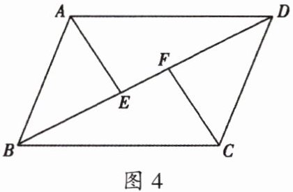2. 如图 4,在 $ \square ABCD $ 中,$ E $、$ F $ 为对角线 $ BD $ 上的两点,且 $ \angle BAE = \angle DCF $。