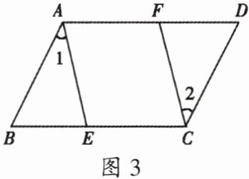 1. 如图 3,四边形 $ ABCD $ 是平行四边形,$ E $、$ F $ 分别是 $ BC $、$ AD $ 上的点,$ \angle 1 = \angle 2 $。