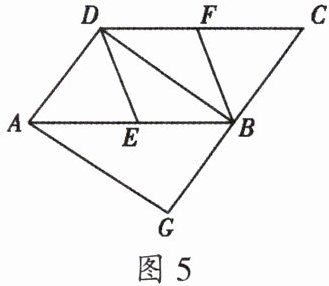 1. 如图 5,在 $ □ABCD $ 中,$ E $、$ F $ 分别为边 $ AB $、$ CD $ 的中点,$ BD $ 是对角线,过 $ A $ 点作 $ AG // DB $ 交 $ CB $ 的延长线于点 $ G $。