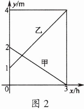 2. 某企业有甲、乙两个长方体的蓄水池,将甲池中的水以 $ 6\mathrm{m}^{3}/\mathrm{h} $ 的速度注入乙池,甲、乙两个蓄水池中水的深度 $ y(\mathrm{m}) $ 与注水时间 $ x(\mathrm{h}) $ 之间的函数图象如图 2 所示,结合图象回答下列问题: