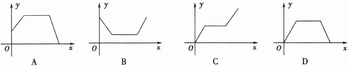 4. 某洗衣机在洗涤衣服时经历了注水、清洗、排水三个连续过程(工作前洗衣机内无水),在这三个过程中洗衣机内水量 $ y $(升)与时间 $ x $(分)之间的函数关系对应的图象大致为()