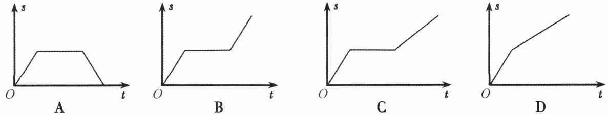 5. 一艘轮船在同一航线上往返于甲、乙两地。已知轮船在静水中的速度为 $ 15 \mathrm { km / h } $,水流速度为 $ 5 \mathrm { km / h } $。轮船先从甲地顺水航行到乙地,在乙地停留一段时间后,又从乙地逆水航行返回到甲地。设轮船从甲地出发后所用时间为 $ t ( \mathrm { h } ) $,航行的路程为 $ s ( \mathrm { km } ) $,则 $ s $ 与 $ t $ 的函数图象大致是()