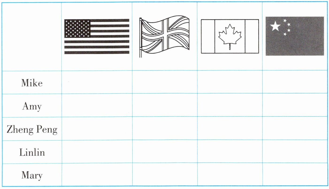 Mike 说“I'm from Canada.”,所以在 Mike 一行的加拿大国旗(第三列)下画√。
