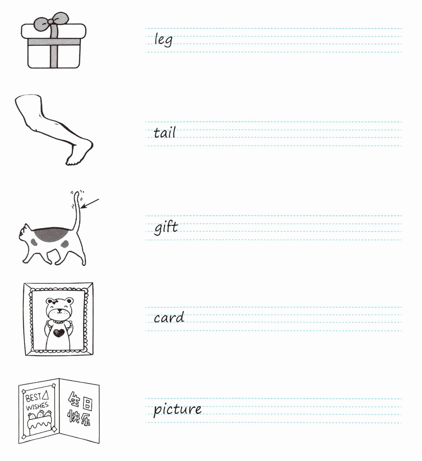 一、将图片与对应单词连线,并在四线三格中抄写单词。