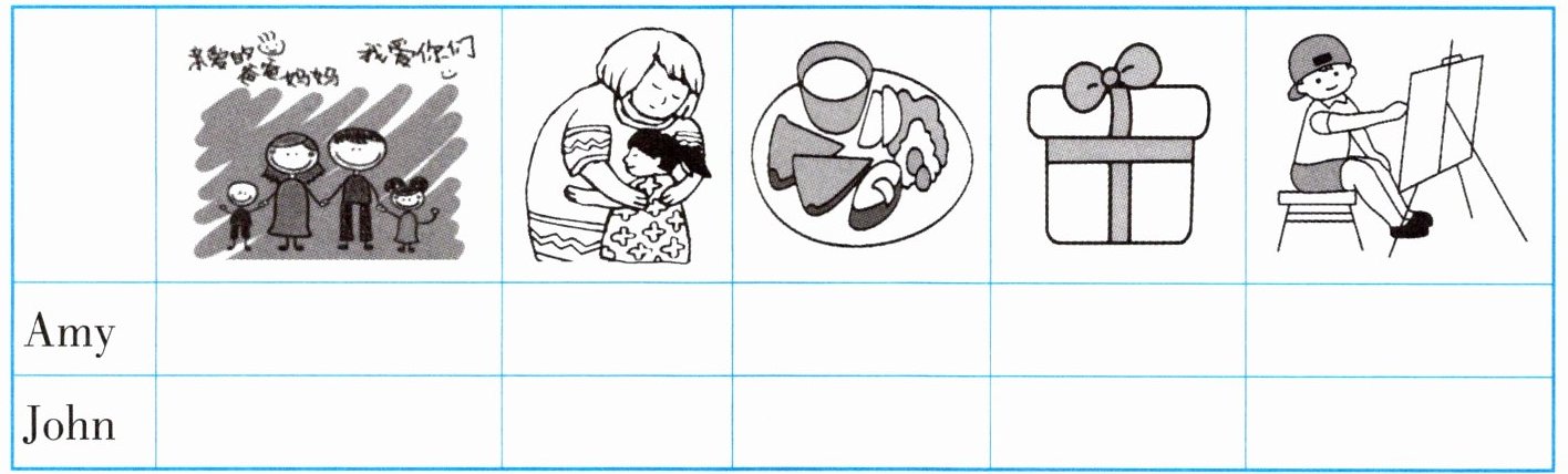 John:在“说‘我爱你们’”“制作礼物”“画画”对应的格子画√。