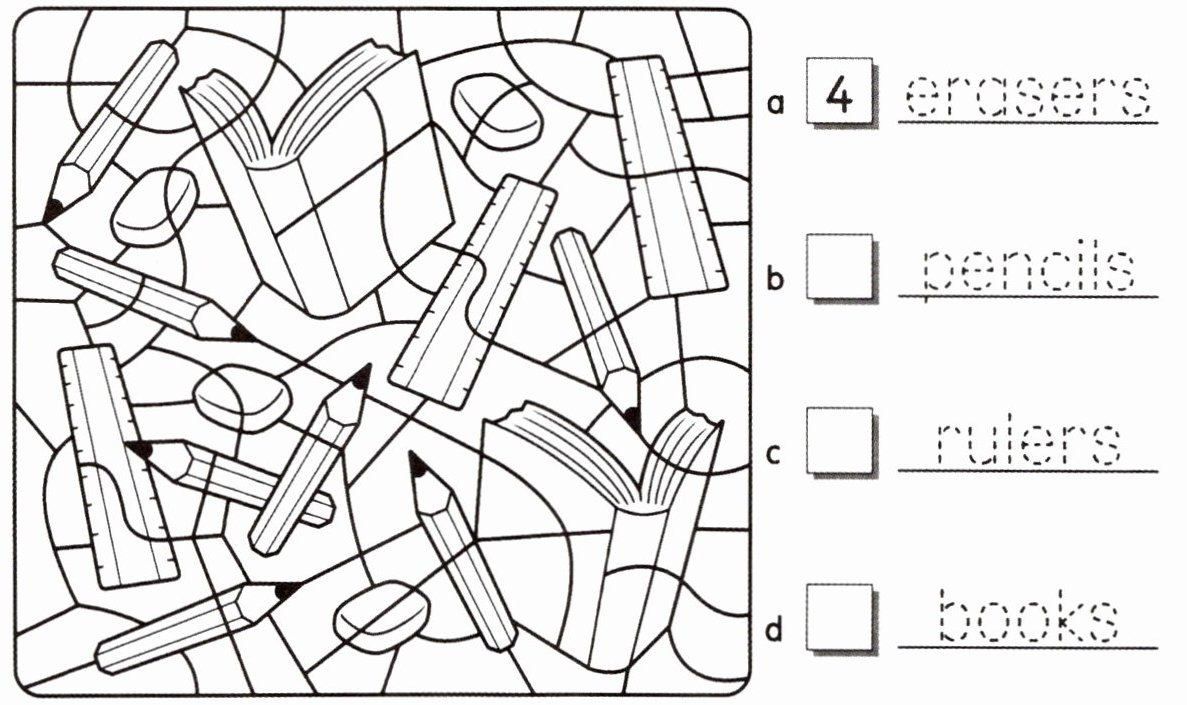 a 4 erasers b 7 pencils c 3 rulers d 2 books