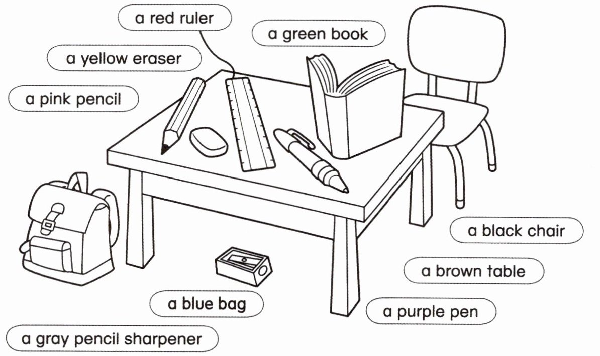 a red ruler——红色尺子;a green book——绿色书;a yellow eraser——黄色橡皮;a pink pencil——粉色铅笔;a black chair——黑色椅子;a blue bag——蓝色书包;a brown table——棕色桌子;a gray pencil sharpener——灰色卷笔刀;a purple pen——紫色钢笔。