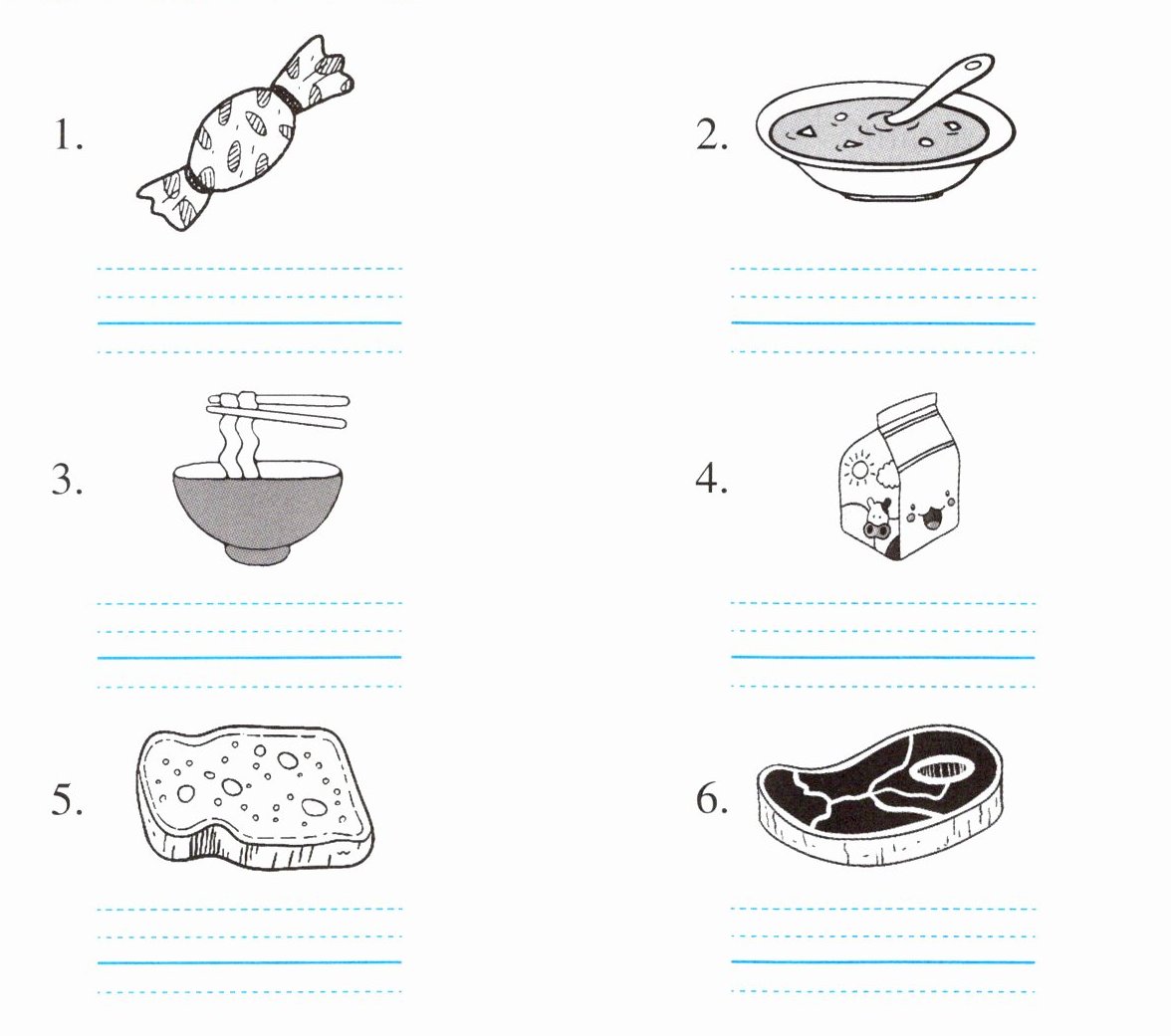 1. candy 2. soup 3. noodles 4. milk 5. bread 6. meat