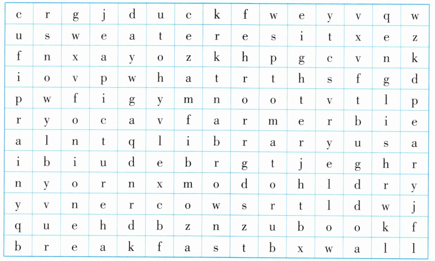 八、同学们,考考你的眼力,找出图中的单词(寻找顺序从左至右,从上至下)。