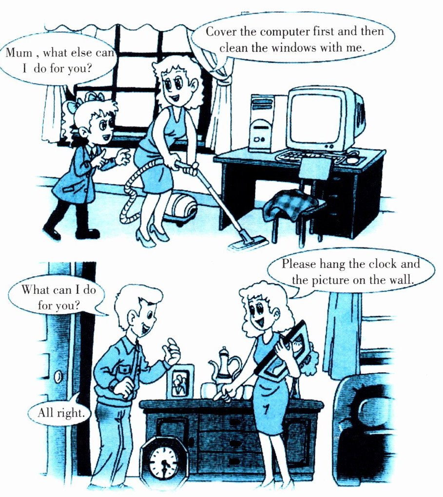 学生可以分别扮演图中的小女孩、妈妈、小男孩等角色,按照对话内容进行表演。比如一个学生扮演小女孩,说“Mum, what else can I do for you?” ,另一个学生扮演妈妈,回答“Cover the computer first and then clean the windows with me.” ;接着再换学生扮演小男孩说“What can I do for you?” ,妈妈(或其他扮演妈妈的学生)回答“Please hang the clock and the picture on the wall.” ,小男孩回答“All right.” 。通过这样的表演来完成题目要求。