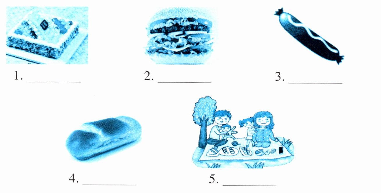 1. cake 2. hamburger 3. sausage 4. bread 5. picnic