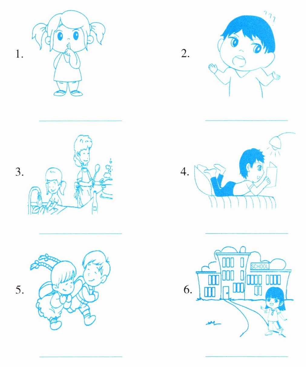 1. 图中女孩把手指放在嘴边,是“安静”的示意,对应的英文单词是“quiet”。