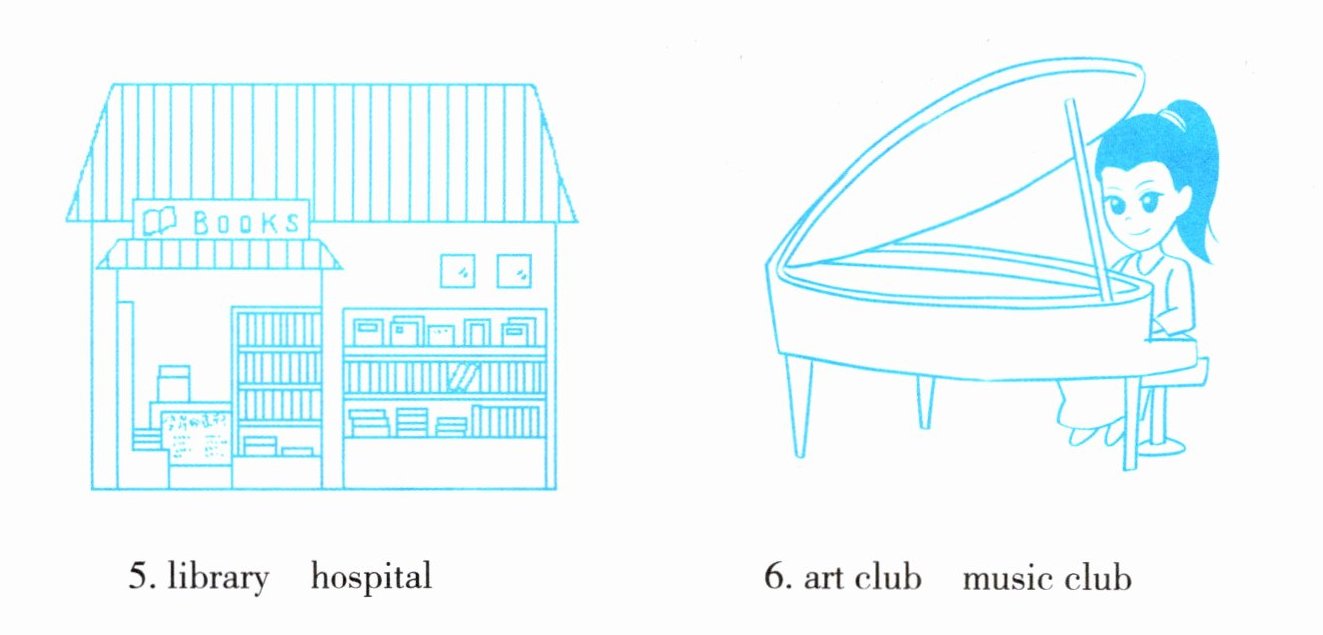 6. 图中人物在弹钢琴,与音乐相关,“music club”是“音乐俱乐部”,“art club”是“美术俱乐部”,所以应在“music club”下画线。