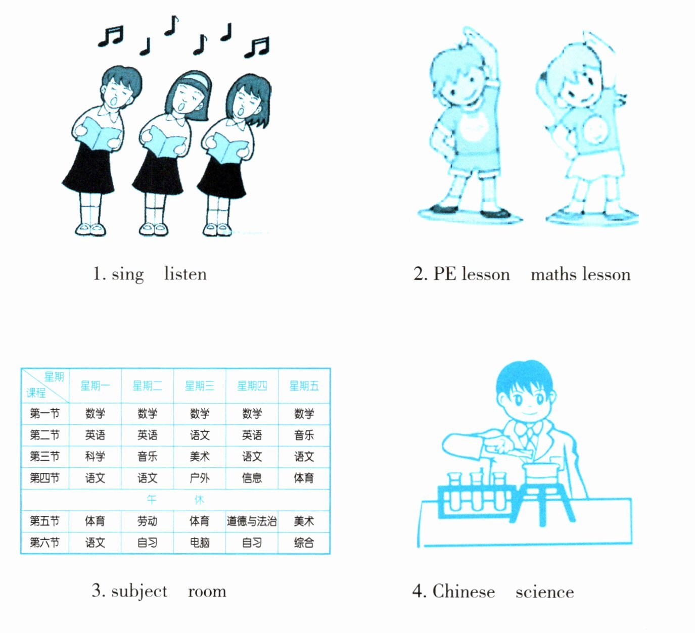 4. 图中人物在做科学实验,“science”是“科学”,“Chinese”是“语文”,所以应在“science”下画线。
