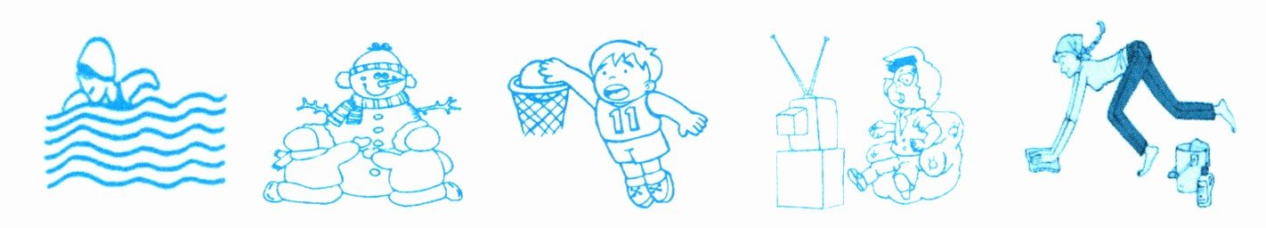 1. clean my room 2. make a snowman 3. play basketball 4. watch TV 5. go swimming