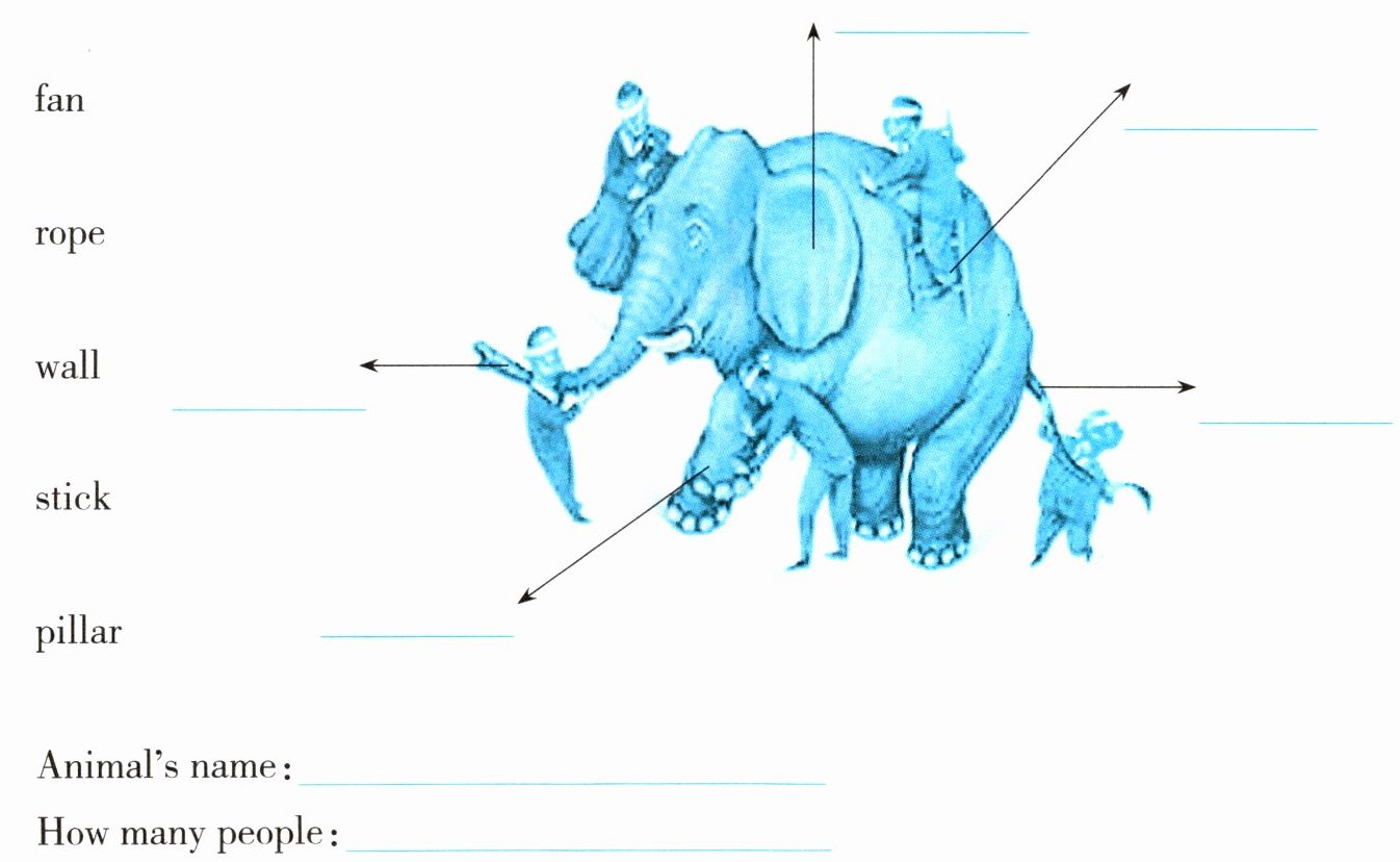 第三个箭头:stick(对应大象的腿,像柱子,这里 stick 不太准确,应该是 pillar 对应腿, stick 对应象鼻前盲人拿的棍子,可能题目排版问题,假设按题目要求连线)