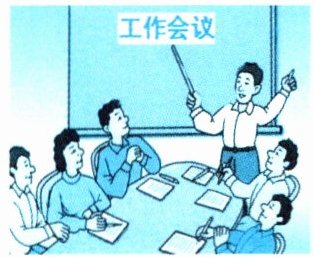 4. 图中有“工作会议”字样,说明是开会的场景,B选项“We often have a meeting here.”(我们经常在这里开会。)符合图意。