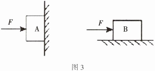 12. 如图3所示,物体A重30N,用F等于50N的力垂直压在墙上静止不动,则物体A所受的摩擦力是______N;物体B重30N,受到F等于20N的水平推力静止不动,则物体B所受的摩擦力是______N。