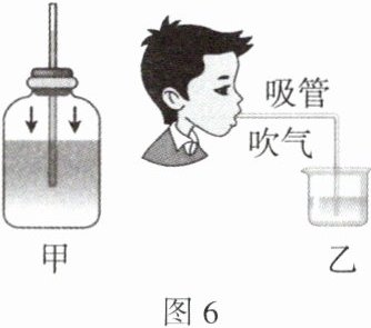17. 取一个瓶子,装入适量红色的水,再取一根两端开口的细玻璃管,在它上面画上刻度,使玻璃管穿过橡皮塞插入水中,从玻璃管上端吹入少量气体,水沿玻璃管上升到瓶口以上,这样就制成了一个气压计,如图6甲。小丽将该气压计从5楼带到1楼的过程中,观察到玻璃管内水面______;如图6乙,她又去掉橡皮塞,待水面静止时,用一支吸管,将管口靠近玻璃管上端,通过吸管向右吹气,观察到玻璃管内水面______。(选填“上升”“不变”或“下降”)