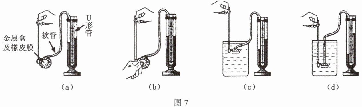 (2)小明再做图7(b)所示的检查。当用手指按压(不论轻压还是重压)橡皮膜时,发现U形管两边液柱的高度几乎不变化。出现这种情况的原因是______。