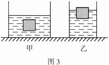 7. 水平桌面上甲、乙两个质量相等但底面积不同的圆柱形容器内装有质量相等的不同液体,两个完全相同的物体在甲、乙两容器中静止时如图3所示。下