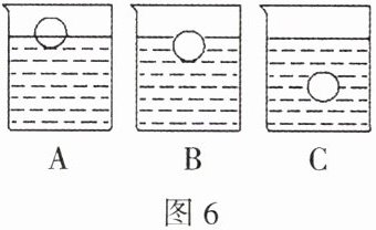 14. 将体积相同的三个实心小球,分别放入盛有水的A、B、C三个容器中,静止后的位置如图6所示,若三个小球所受的浮力分别用$F_{A}$、$F_{B}$、$F_{C}$表示,则它们的大小关系是______;______容器中的小球密度最大。