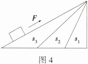 7. 如图4所示,将同一物体分别沿$ s_{1} $、$ s_{2} $、$ s_{3} $三个等高斜面匀速拉到顶部,且$ F_{1}>F_{2}>F_{3} $,则拉力所做的有用功()