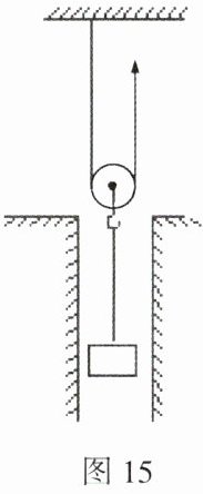 23. 如图15所示,某矿产工人用200N的竖直向上的拉力,抓紧绳子的一端,沿竖直方向向上运动,在10s内将矿井里质量为32kg的物体提升4m,若不计一切摩擦。求:($ g $取10N/kg)