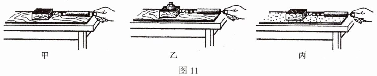 21. 在探究“摩擦力的大小与什么因素有关”时,小华同学根据自己推箱子时,箱子越重,推起来越费力,提出了“影响摩擦力大小的因素可能与接触面受到的压力有关”的猜想;小辉同学根据自己推箱子时,地面越粗糙,推起来越费力,提出了“影响摩擦力大小的因素可能与接触面的粗糙程度有关”的猜想。图11是验证他们猜想的实验装置图。
