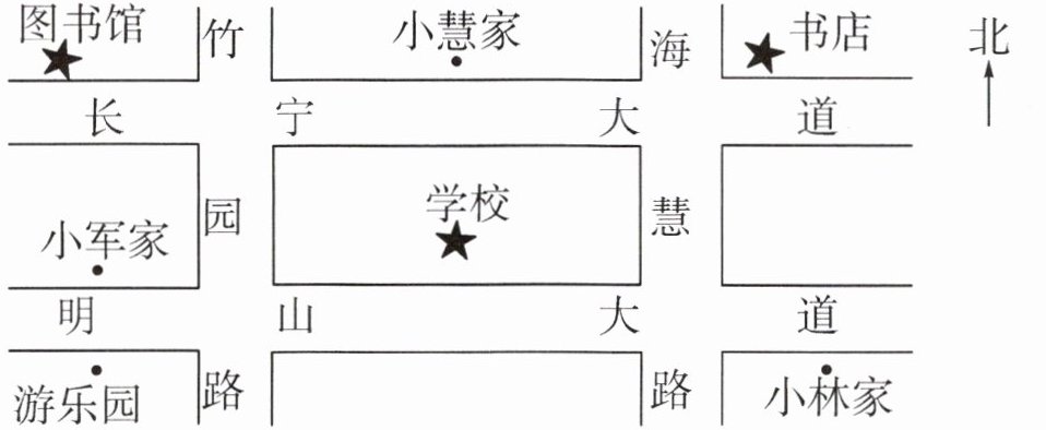 2. 学校的西面是(小军家),学校的北面是(小慧家),学校的东北方向是(书店),学校的东南方向是(小林家),学校的西北方向是(图书馆),学校的西南方向是(游乐园)。