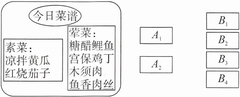 4.家常快餐店的菜谱如下。选一种素菜和一种荤菜,一共有几种选法?连一连。(A表示素菜,B表示荤菜)