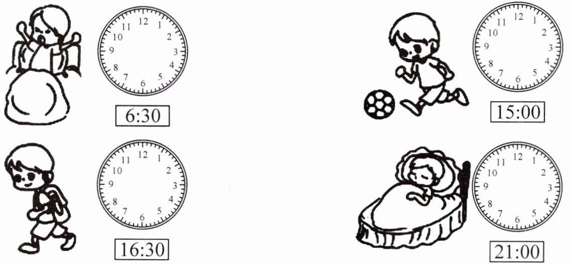 - $16:30$:时针在$4$、$5$中间,分针指向$6$。