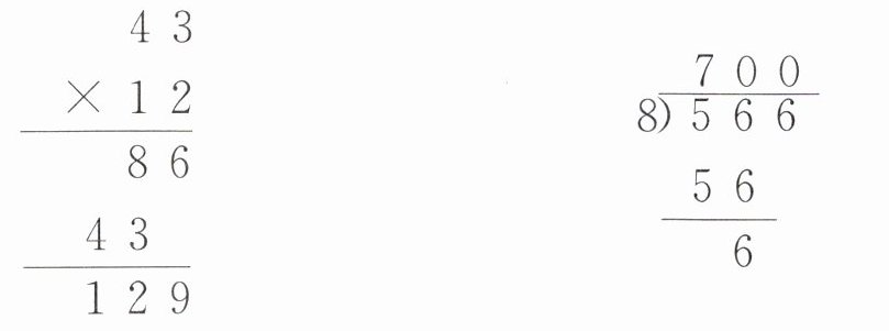 解:对于$43×12$,根据两位数乘两位数的计算方法$a×(b + c)=a× b+a× c$(这里$a = 43$,$b = 10$,$c = 2$),$43×12=43×(10 + 2)=43×10+43×2$。
