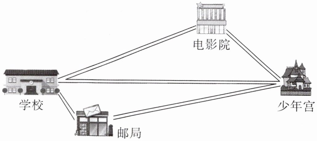 从学校到少年宫有$3$种走法。直接从学校到少年宫的路最近,因为两点之间,线段最短。