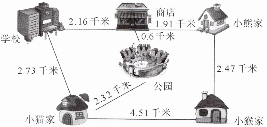 1. 小猴从家到商店走哪条路最近? 这条路长多少千米?