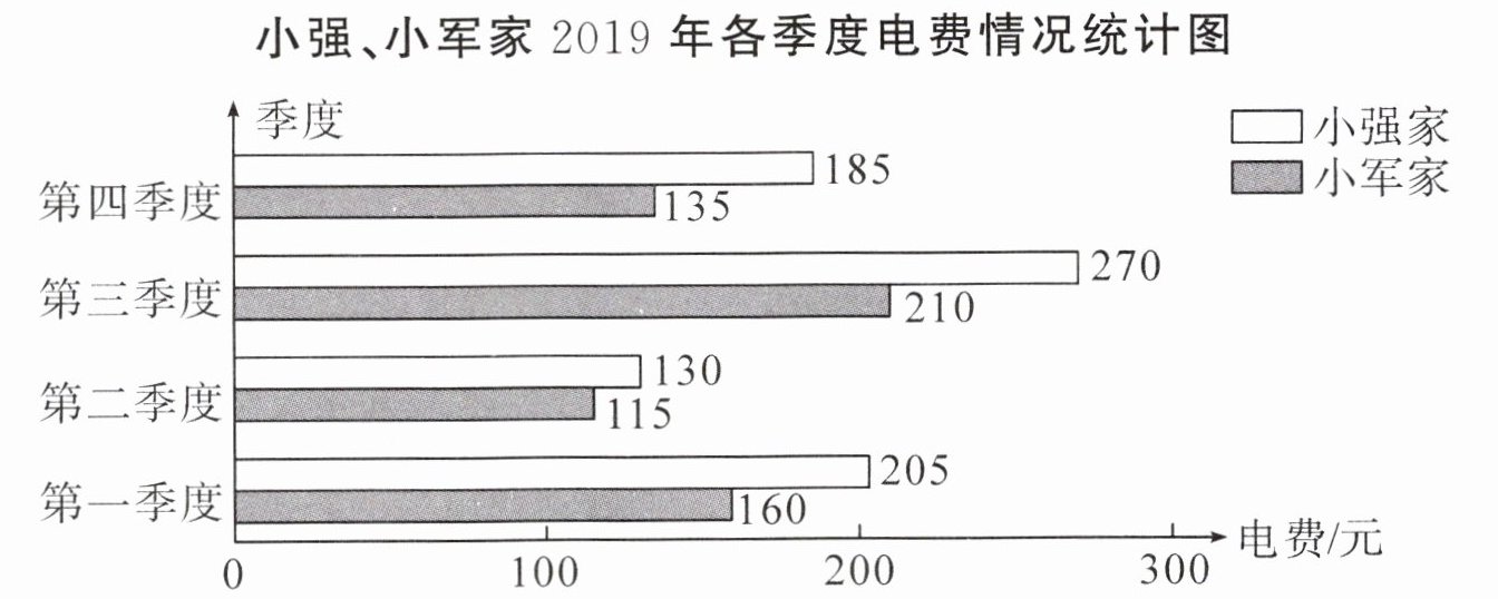 1. 小强家和小军家 2019 年各季度电费情况如下图: