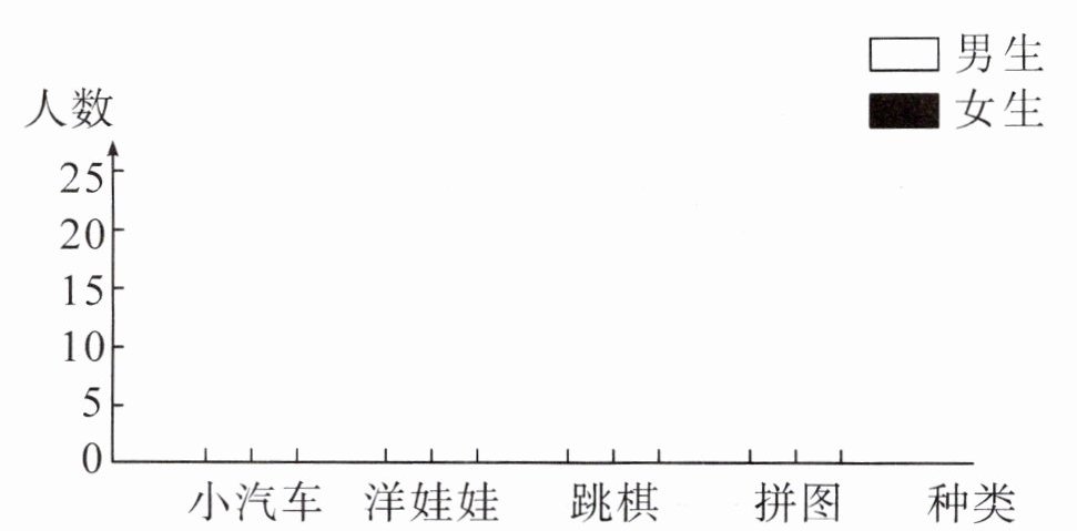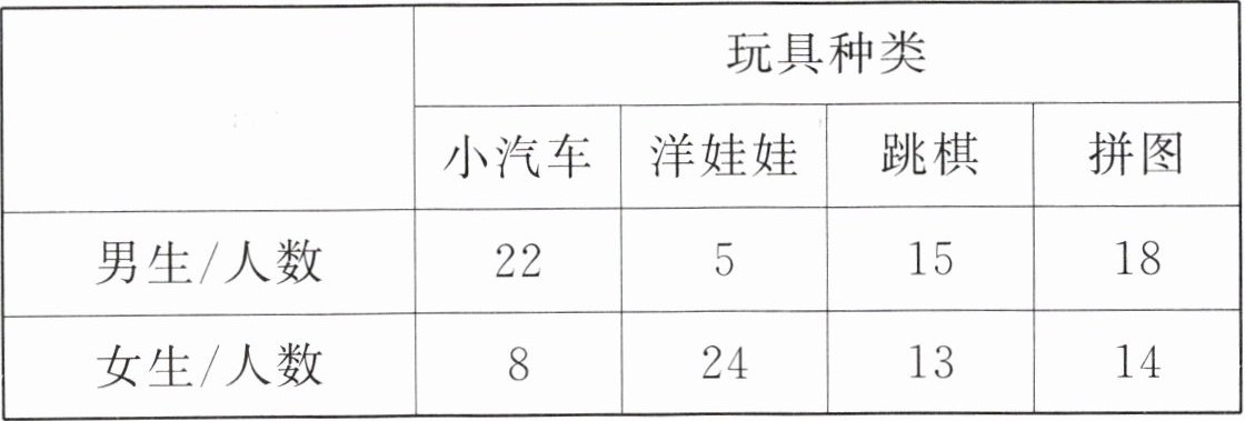 男生喜欢玩洋娃娃的人数最少(答案不唯一)。