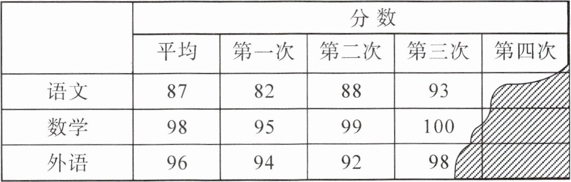 第四次语文分数是$85$分,数学分数是$98$分,外语分数是$100$分。