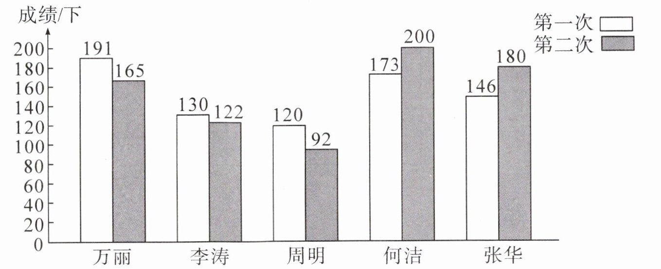 4.下面是5名同学参加1分钟跳绳训练,两次成绩情况统计图。